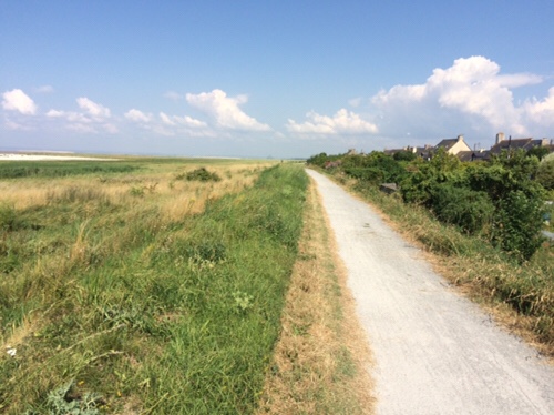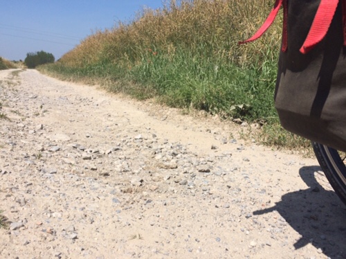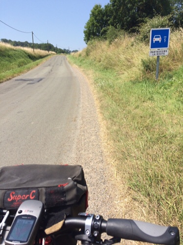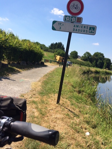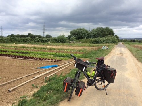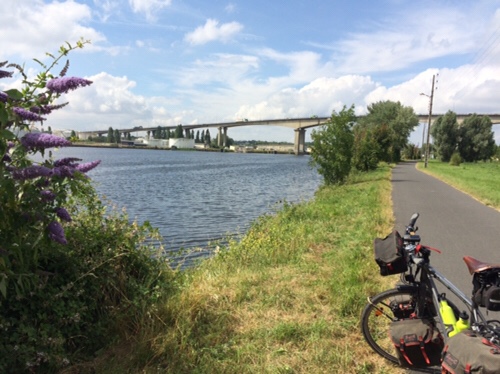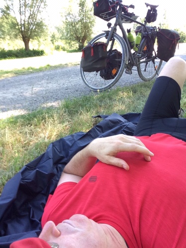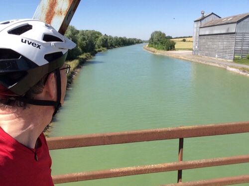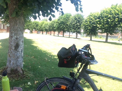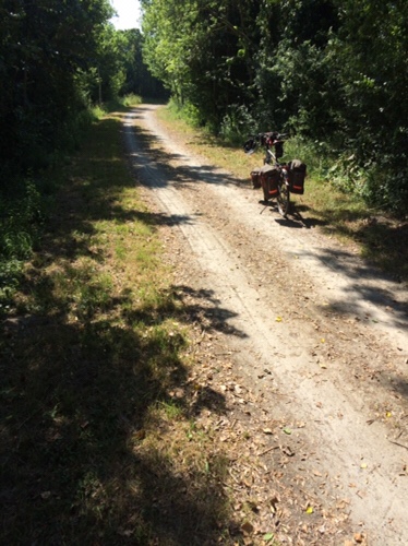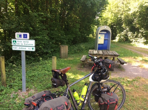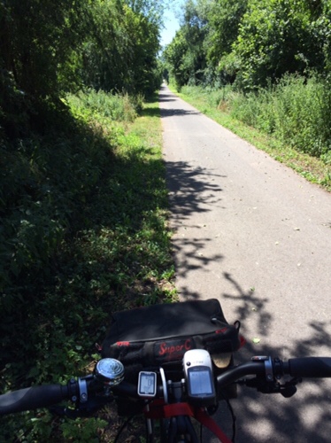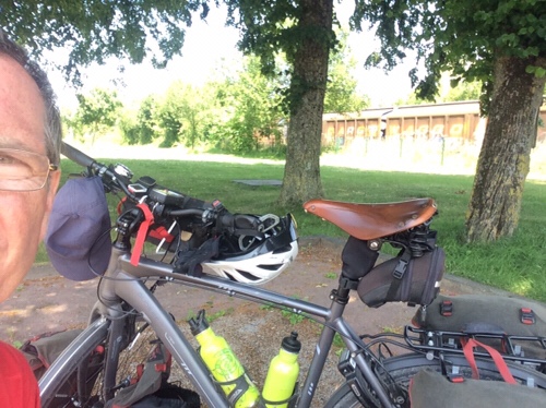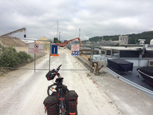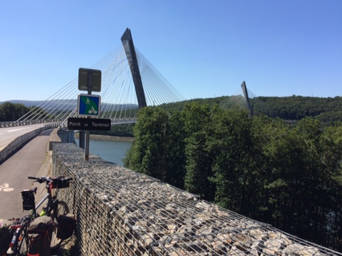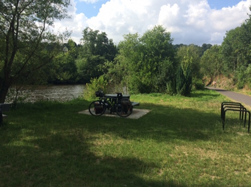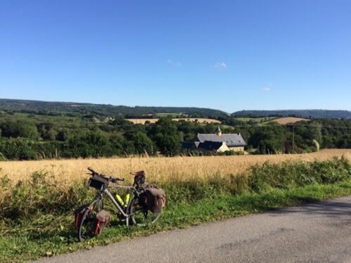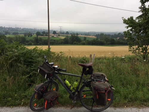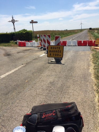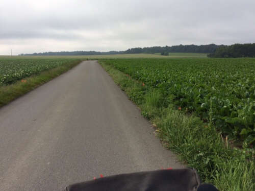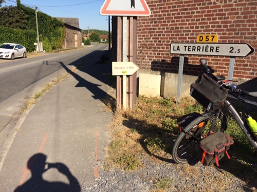 15:00 Uhr – Die Radlerin vor mir hat mich die letzten fünf Kilometer begleitet. Wir haben uns auf Deutsch mit französischen Einschüben unterhalten. Sie war bei ihrer Schwester und hatte eine Tüte Eier am Lenker. Die Trasse wird gerade zum Teeren vorbereitet. Sie wollte sehen, ob sie für mich fahrbar ist und hat extra mit mir einen Umweg von zwei, drei Kilometern gemacht. Das hilft beim Ankommen im fremden Land.