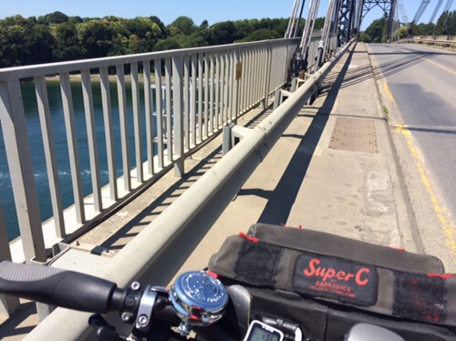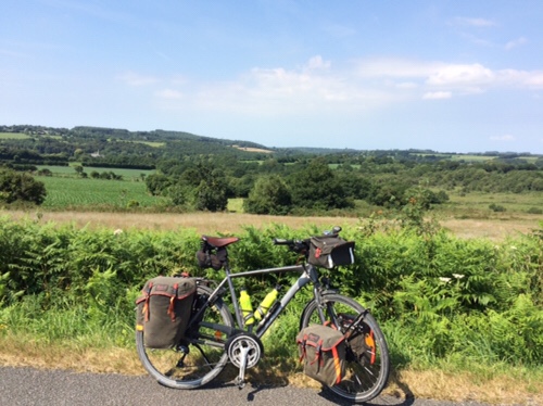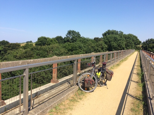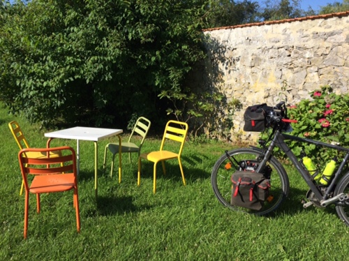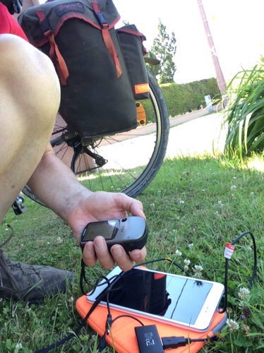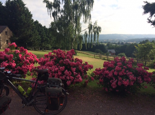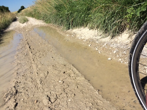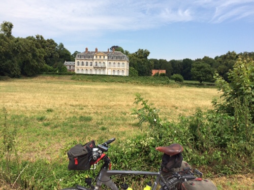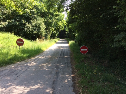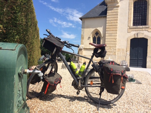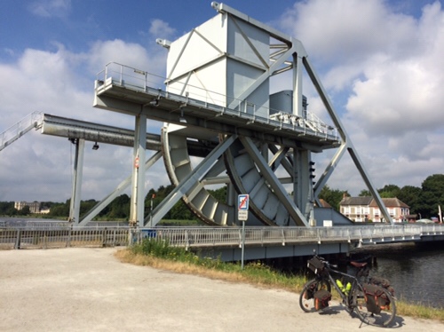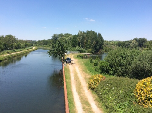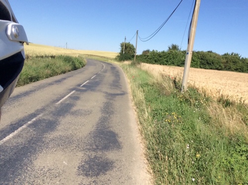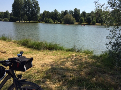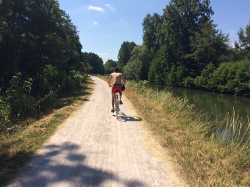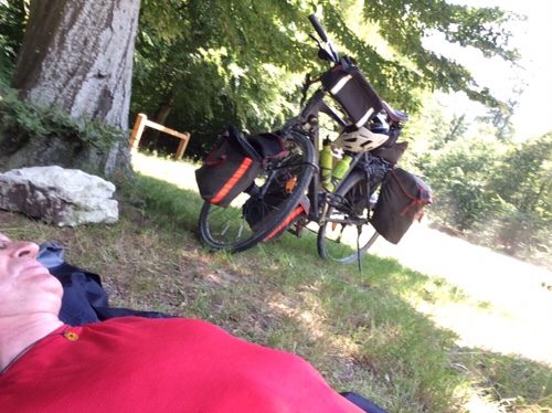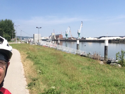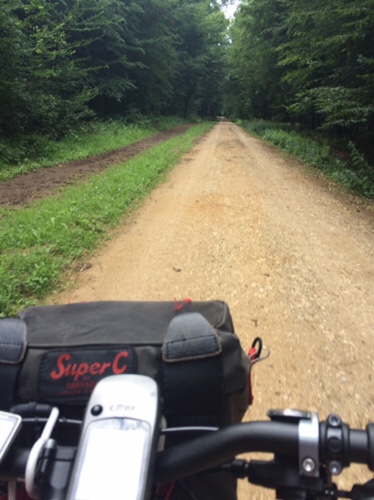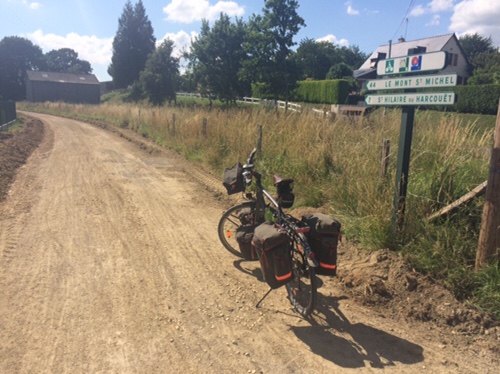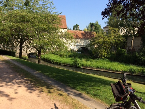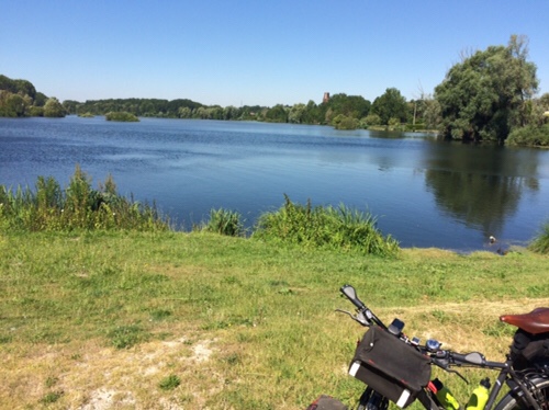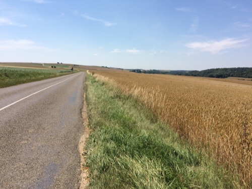 15:00 Uhr – Die Radlerin vor mir hat mich die letzten fünf Kilometer begleitet. Wir haben uns auf Deutsch mit französischen Einschüben unterhalten. Sie war bei ihrer Schwester und hatte eine Tüte Eier am Lenker. Die Trasse wird gerade zum Teeren vorbereitet. Sie wollte sehen, ob sie für mich fahrbar ist und hat extra mit mir einen Umweg von zwei, drei Kilometern gemacht. Das hilft beim Ankommen im fremden Land.