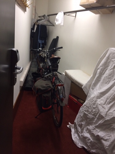Ein ruhiger Platz für den Drahtesel. Ich hatte mit Parkhaus und Gebühren gerechnet. Dafür musste ich 25€ Kaution zahlen, ich könne ja was kaputt machen. Wie zu erwarten, hat das Einchecken fast 20 min gedauert, obwohl ich schon über HRS bezahlt hatte. Davon entfielen 5min auf die Bestätigung, dass ich die Touristensteuer bezahle habe. Ich stelle mir das wohl zu einfach vor.