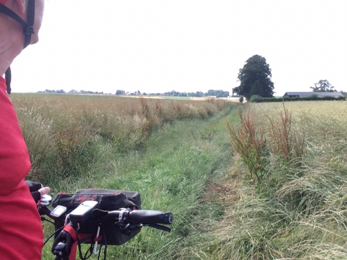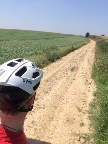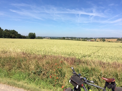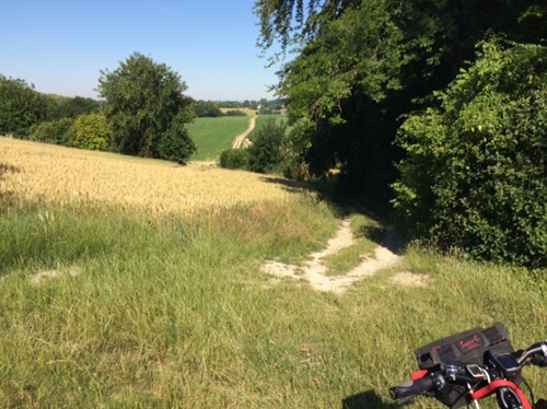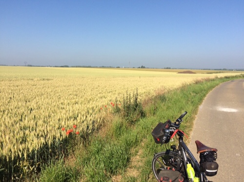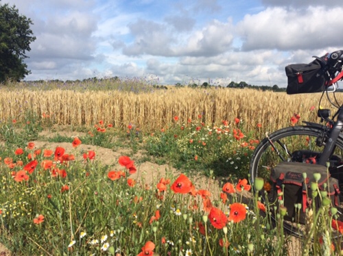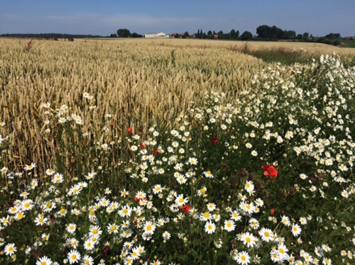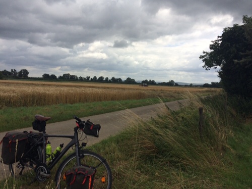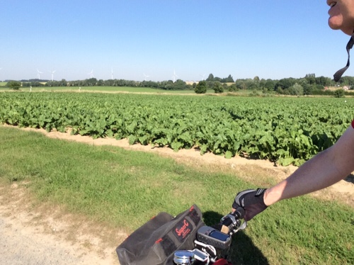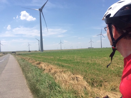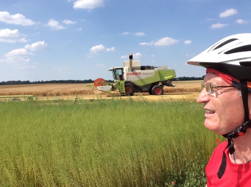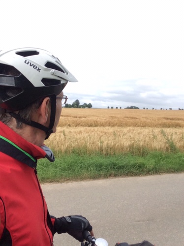 Vor mir springt ein Reh ins Kornfeld, es taucht bei jedem Sprung auf und verschwindet wieder zwischen den hohen Halmen. Und ein Stück weiter hoppelt ein Hase über den Weg. Es gab auch schon einige tief fliegende Milane, die seinen Kollegen und ihm auf den Fersen sind. Es gibt also auch in diesen riesigen Feldern Leben. Die kleinen Blumenstreifen alle paar Kilometer wirken aber sehr nach reiner EU-Förderprämie. Da ginge sicher mehr. Dafür sind die Radwege super in Schuss und bestens ausgeschildert.