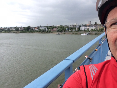 14:35 Uhr – Ich überquere den Rhein. Vorhin in Beuel hat der Himmel noch drei kleine Tränchen geweint. Vor mir wird es heller.