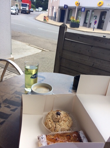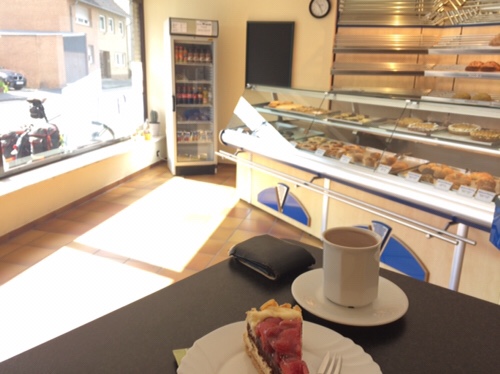 16:45 Uhr – In der Bäckerei Niestroj in Großbüllesheim. Habe 30km und brauche jetzt dringend eine kleine Pause. Das Hotel weiß, dass ich erst zwischen sechs und acht ankomme.
