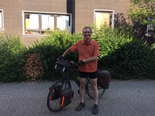 Lenkertasche, Wasser, Buch, Hemd und Fleecejacke, falls die Klimaanlage zu kalt ist, habe ich in den Rucksack gepackt. Mal sehen, ob ich die Fahrradtaschen vor oder erst im Zug abnehmen muss. Ich habe auch die Überhose angezogen, das ist bequemer und die wichtigsten Wertsachen sind in den Hosentaschen. Für die Zeit auf dem Rad reichte eine Radhose mit Einsatz völlig.