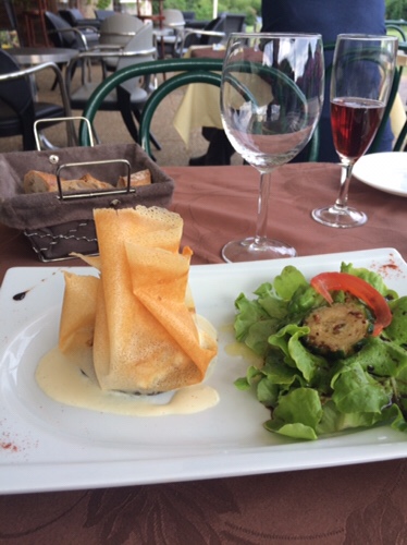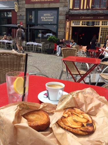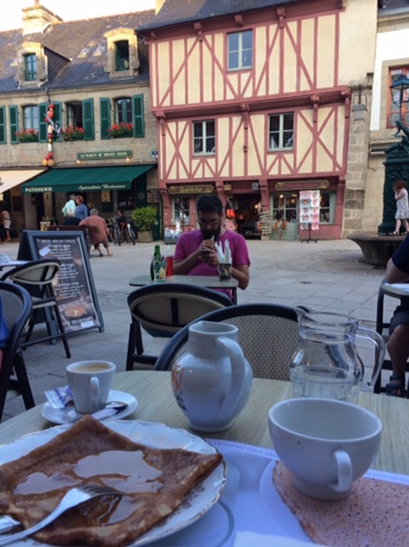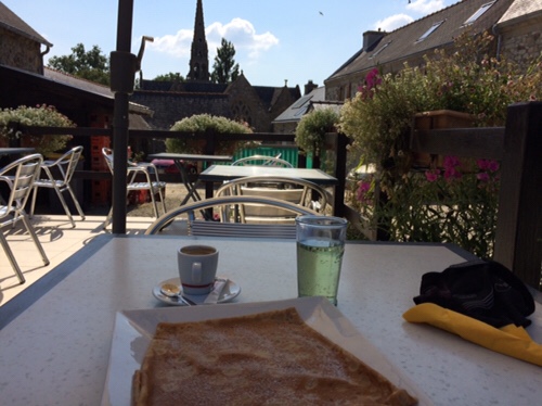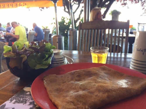 Zwei Gänge Galette, zum Nachtisch Crêpes Caramel mit Espresso auf dem zentralen Platz der Ville Close.