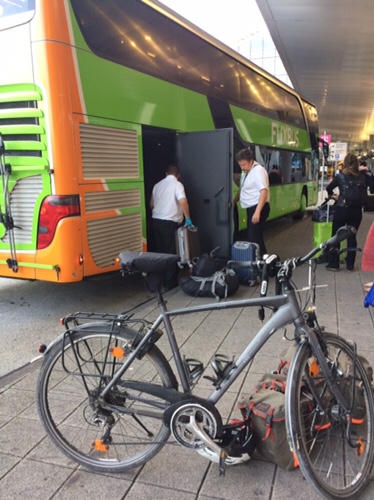 Es kommt noch eine junge Frau neben mich, das wird eng. Immerhin gibt es Steckdosen zum Handy-Laden in jeder Reihe. Ich nehme den Bus ja nicht wegen der Bequemlichkeit oder des Preises, sondern weil es mit dem Rad die beste Alternative zum Fliegen ist. Mit dem Zug müsste ich alles im Nahverkehr fahren und bräuchte zwei Tage.