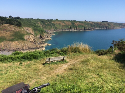 14:15 Uhr – An dieser Picknickbank durfte ich nicht vorbei fahren. Der Blick geht zum Cap Dinan, man erkennt den Felsbogen. Rechts am Ende der Bank sitzt eine Eidechse.