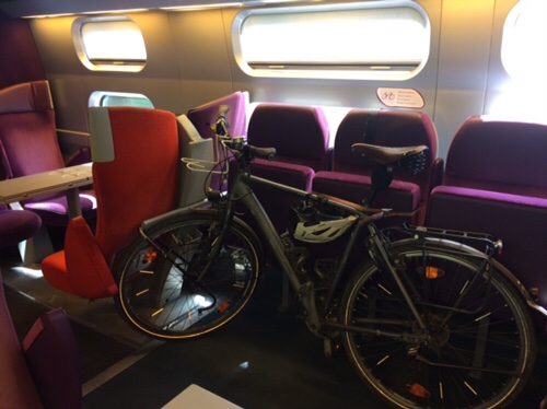 15:29 Uhr – Bin im TGV! das Radabteil sind vier hochklappbare Sitze in einem kleinen 2. Klasse Bereich im ersten Wagen. Vielleicht gibt es davon ja mehrere. Hier passen vielleicht drei, vier gegeneinander gelehnte Räder rein. Für mich super, ich habe den ganzen Bereich für mich!