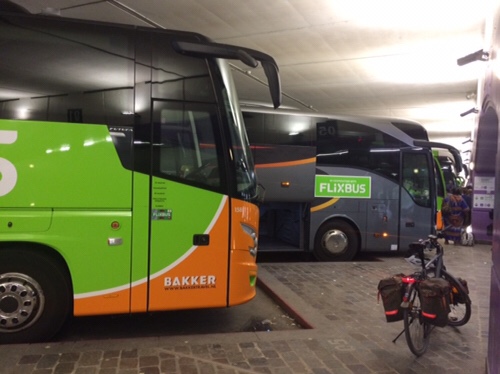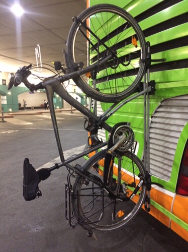 21:30 Uhr – Fahrrad hängt dran. Es gibt genau zwei Aufnahmen. Muss abgeschlossen sein, wird sonst wohl in Brüssel geklaut!? Die Fahrer des BN-Busses sprechen schlechter Deutsch als ich Französisch. Na, er wird ja auch für das gute und sichere Fahren bezahlt. Ich habe also das Rad mit der Kette an den Bus gebunden, und er hat gesagt, so sei es gut gesichert.