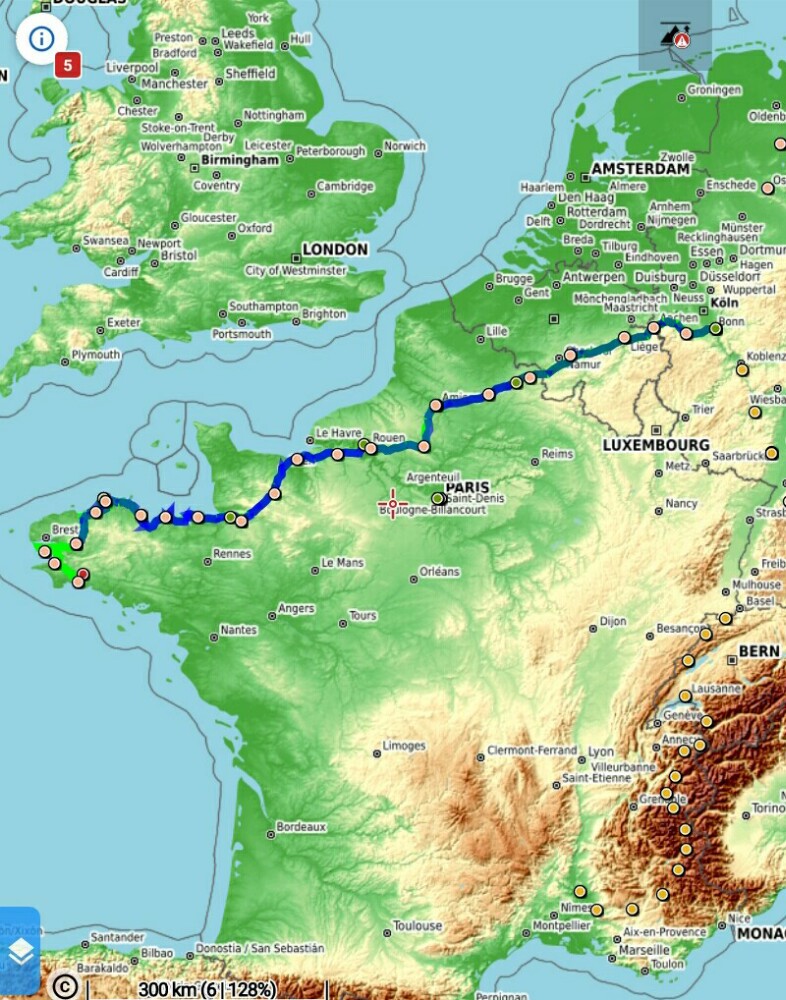 So Schluss für heute. Ich geh ins Hotel. Ich muss für morgen noch umplanen, da das Hotel in Auvelais, das ich mir zu Hause rausgesucht hatte, inzwischen ausgebucht ist.