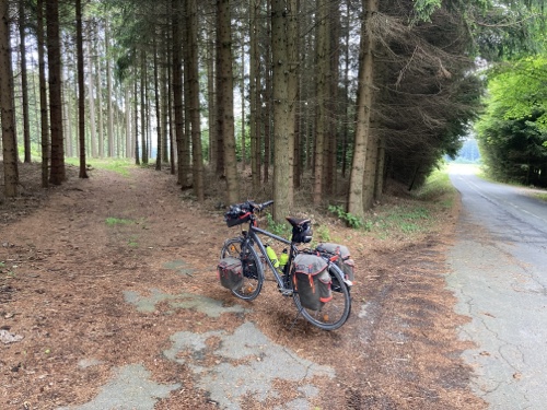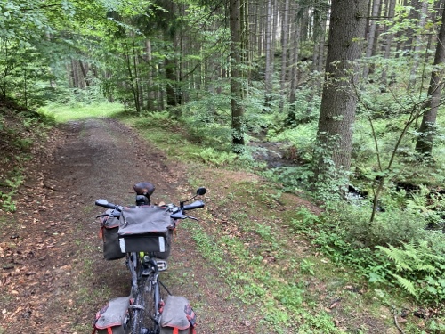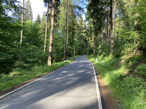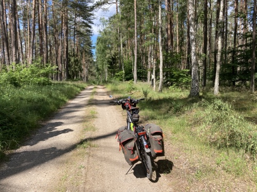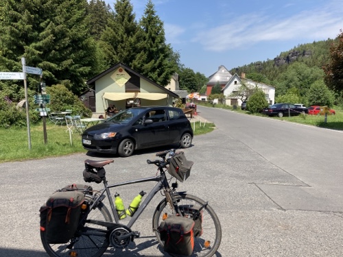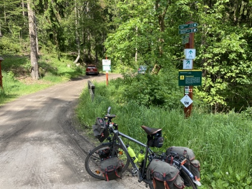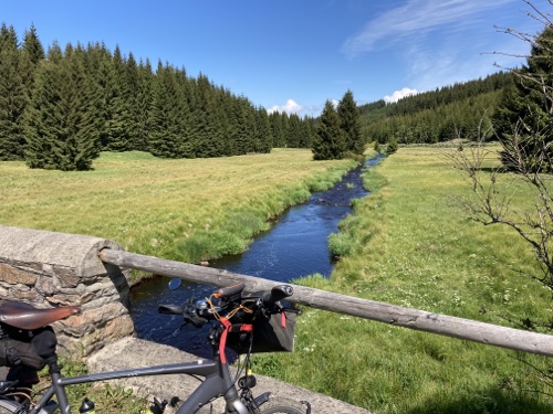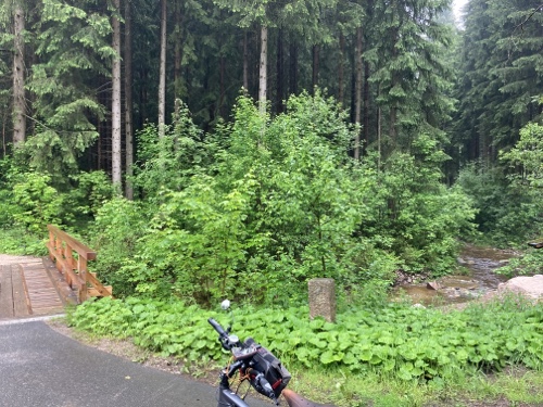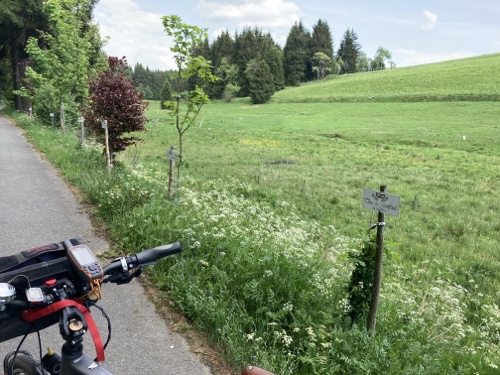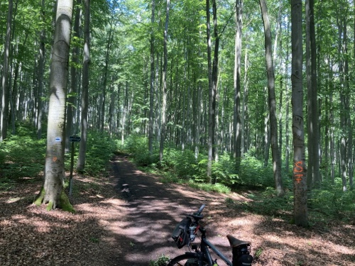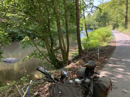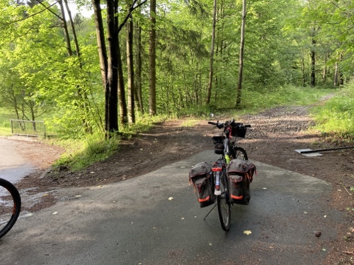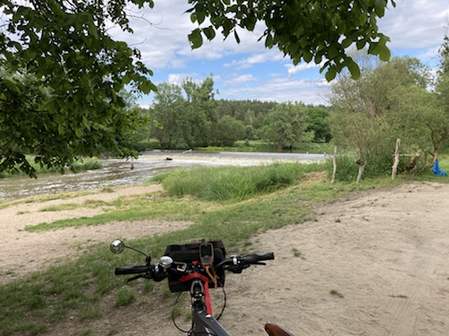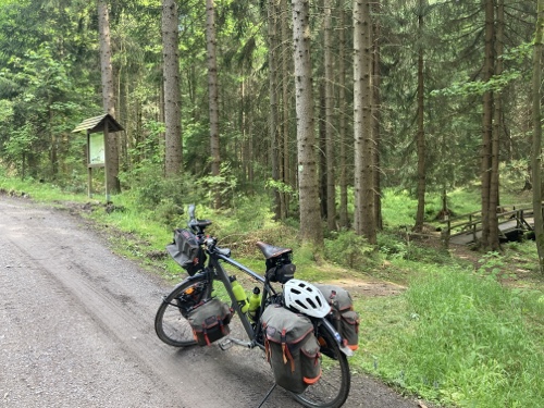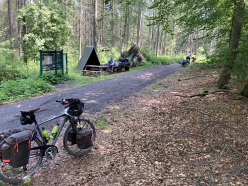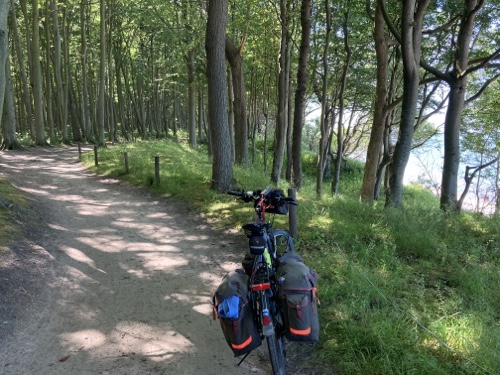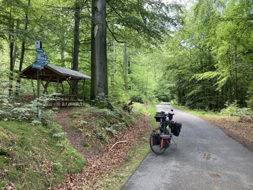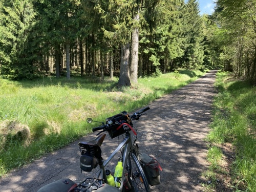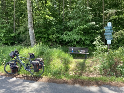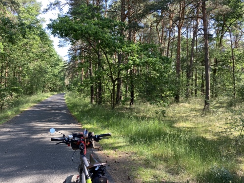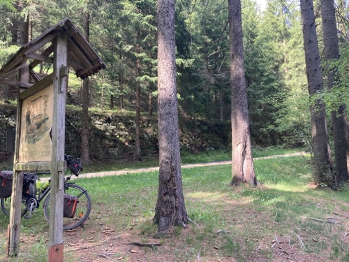 Das Rad stand die ganze Zeit gut im Schatten der Bäume. Hier ist die Luft fast zu kalt für ein T-Shirt. Also schnell aufs Rad und in die Sonne.