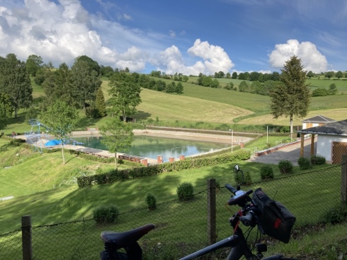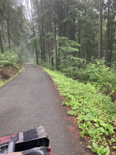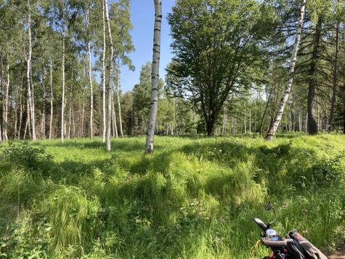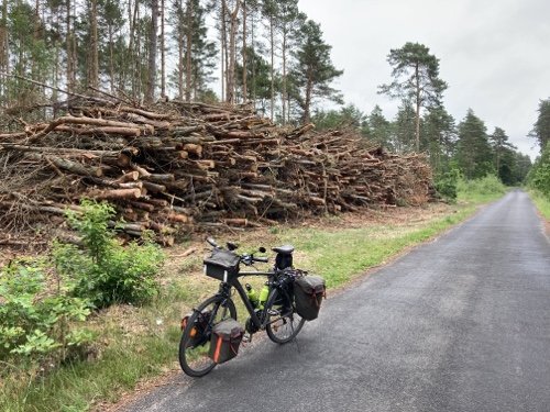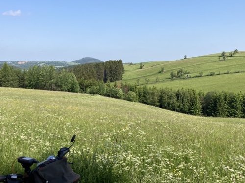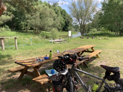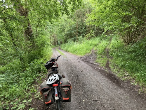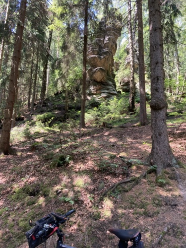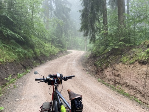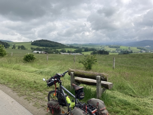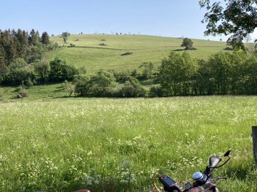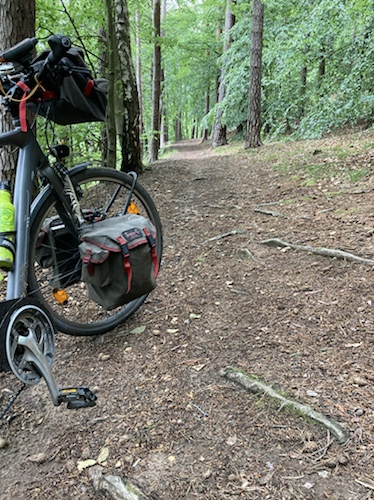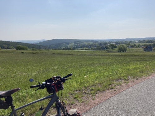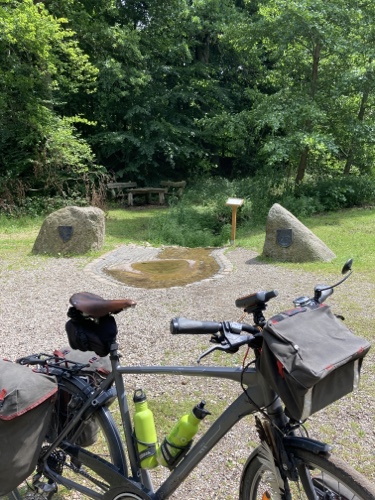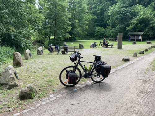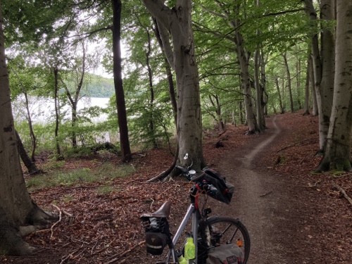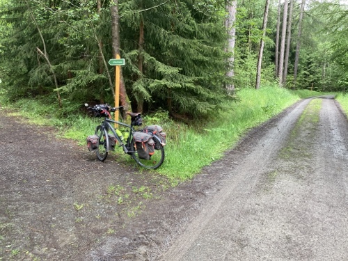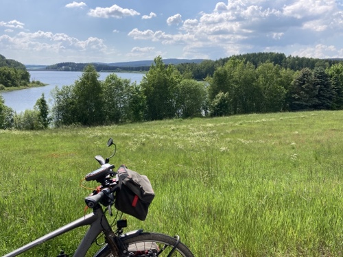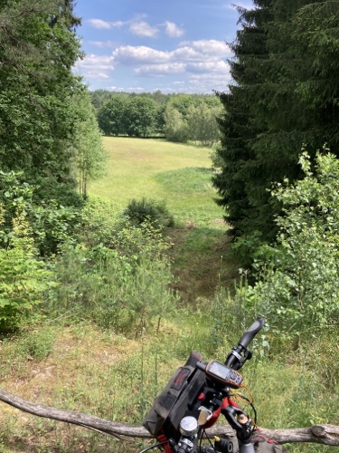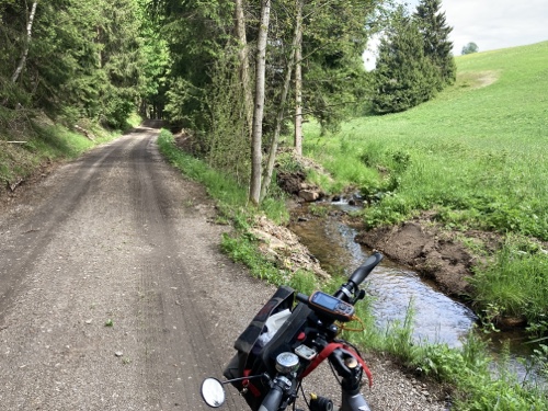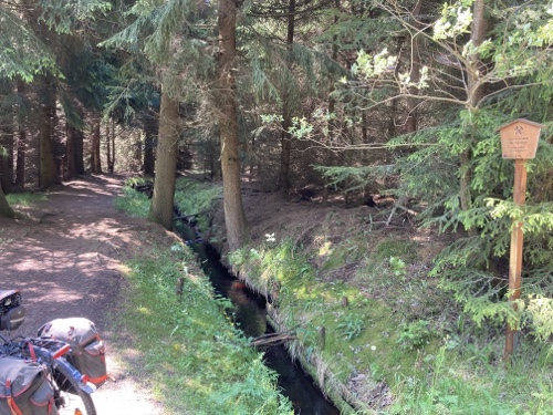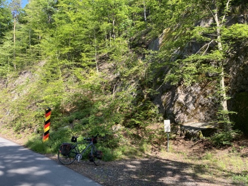 Das Rad stand die ganze Zeit gut im Schatten der Bäume. Hier ist die Luft fast zu kalt für ein T-Shirt. Also schnell aufs Rad und in die Sonne.