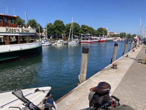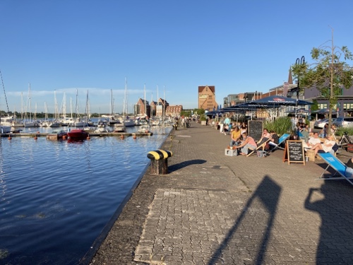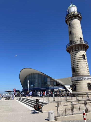 15.33 Uhr – Für den Erinnerungskühlschrankmagneten bin ich nochmal nach Warnemünde geradelt. Am Hafen ist es sehr voll, dahinter aber gar nicht so sehr. Von Südosten ziehen Gewitterwolkrn auf.