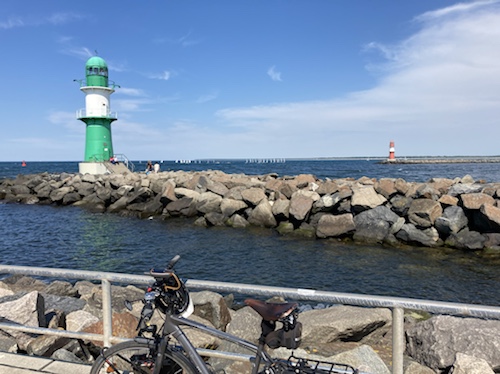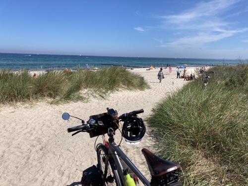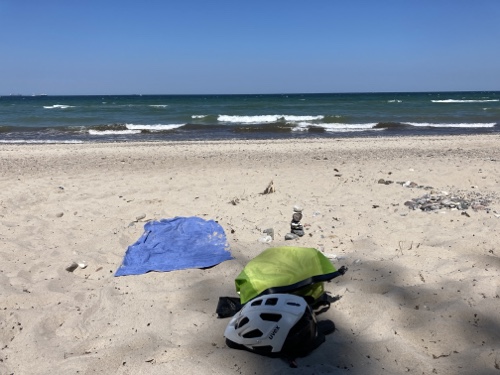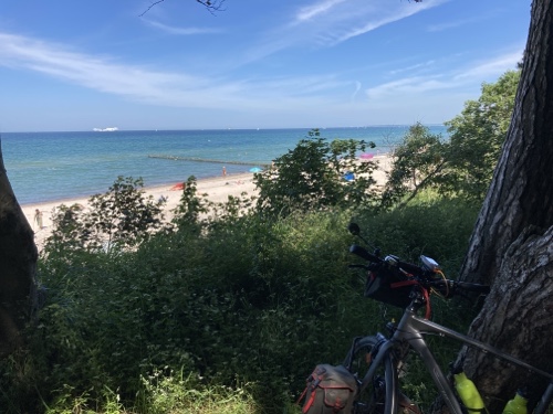 Mein Programm für heute ist im Wesentlichen das gleiche wie gestern, nur ohne die Strecke Rostock-Warnemünde. Ich radle ein Stück zum Strand, esse Kuchen, lege mich in die Sonne, esse Kuchen, lese. Gestern war ich mit vollem Gepäck unterwegs, heute nur mit Strandsachen. Beim Sonnenschutz werde ich etwas gründlicher sein müssen.
