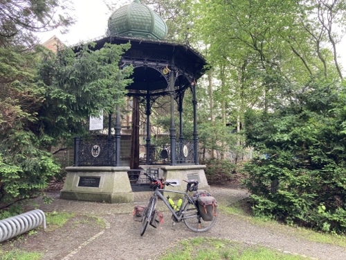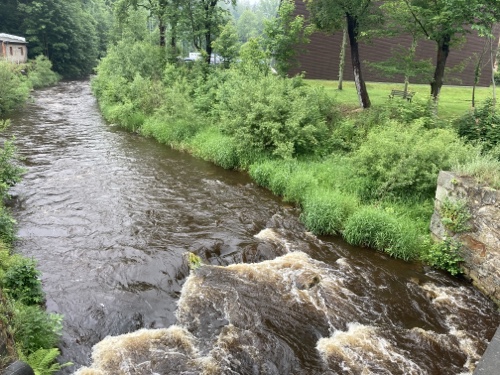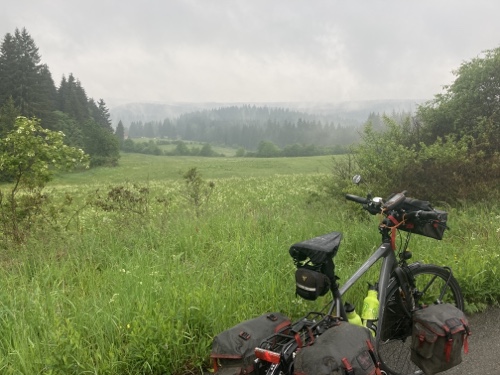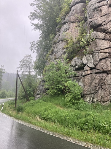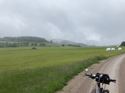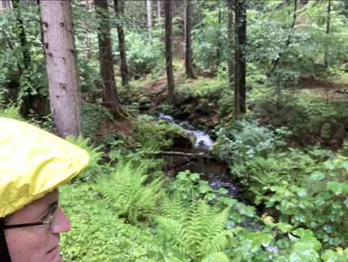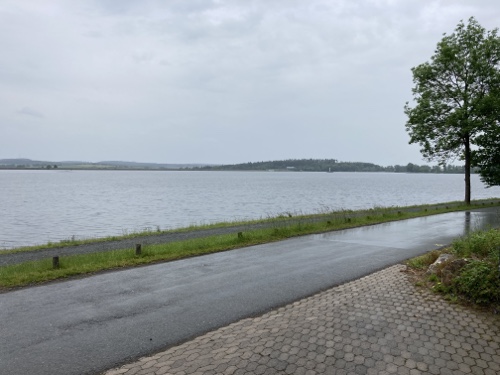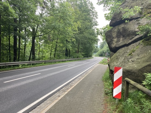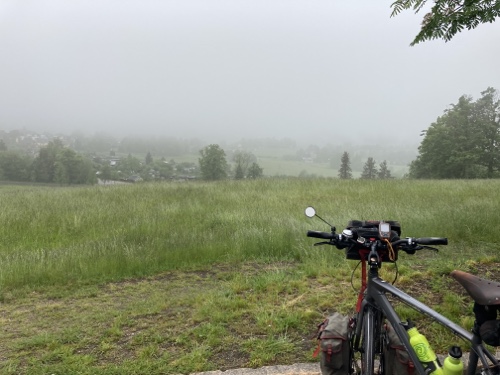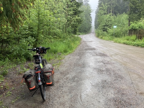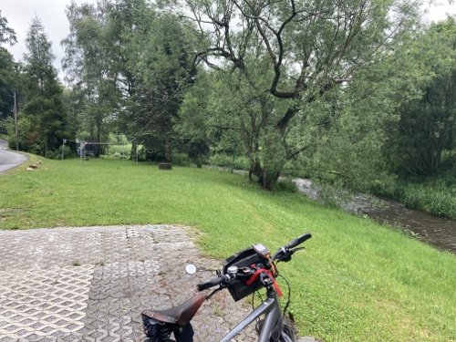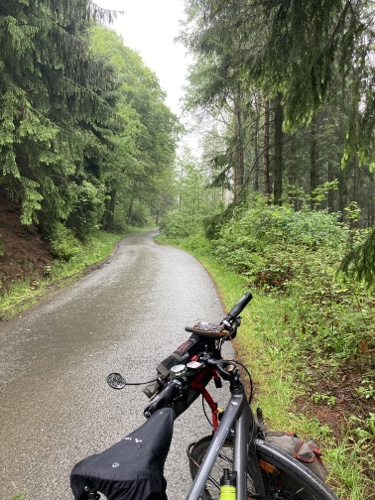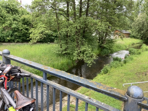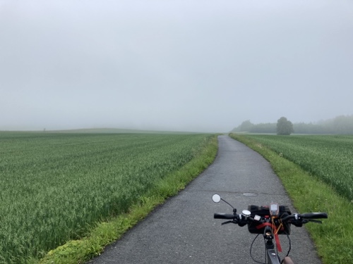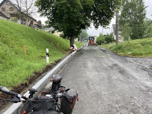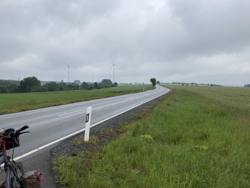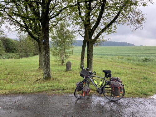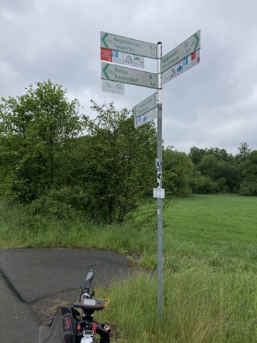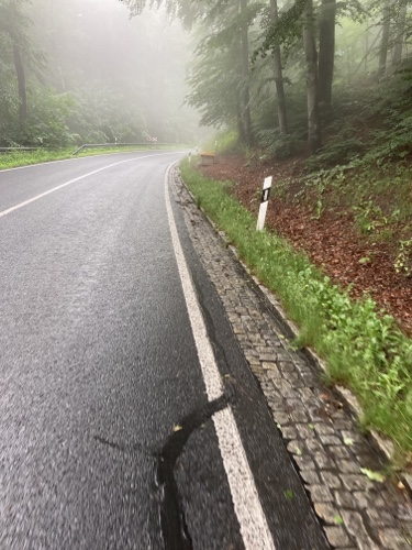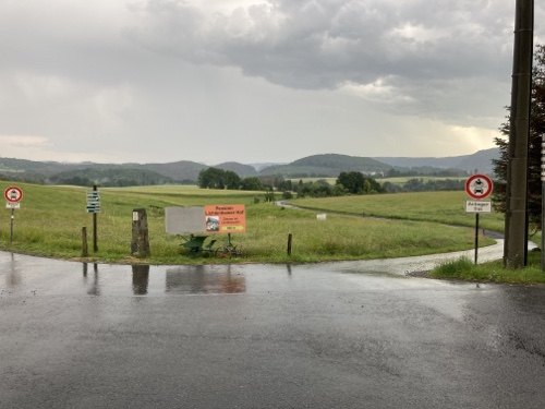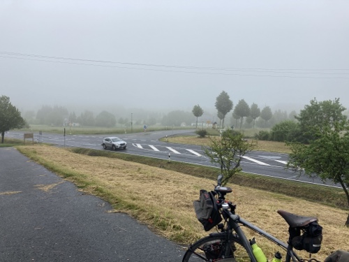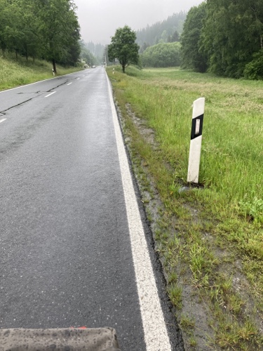 9.29 Uhr – Ich bin sehr froh, dass bis hierher alles so gut geklappt hat. Das Wetter war mental die größte Herausforderung. Hinzukommt, dass bei Regen mit Tropfen auf der Brille und Wasser auf dem Navi die Navigation schwierig ist. Auch die Hände sind ja dann nass und die Bedienung des Handys zum Fotografieren oder zur Absicherung der Route ist fast unmöglich. Wie gut, dass das neue wasserdicht ist.