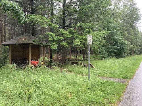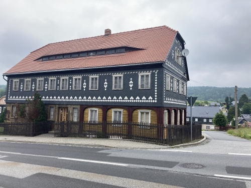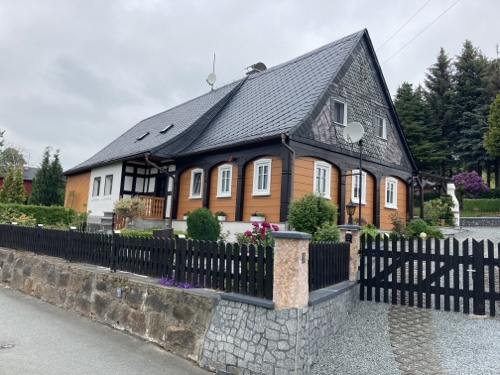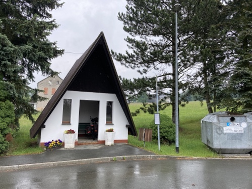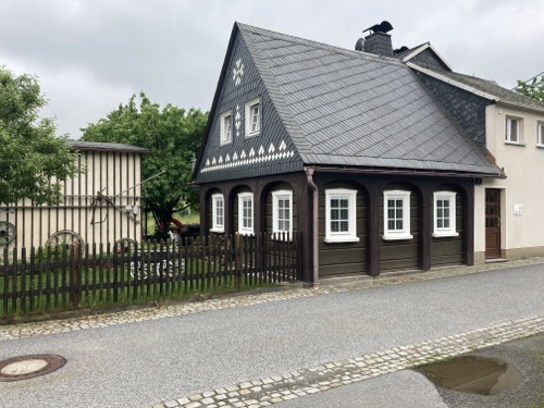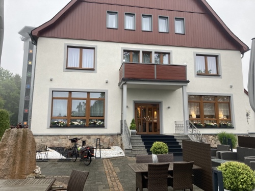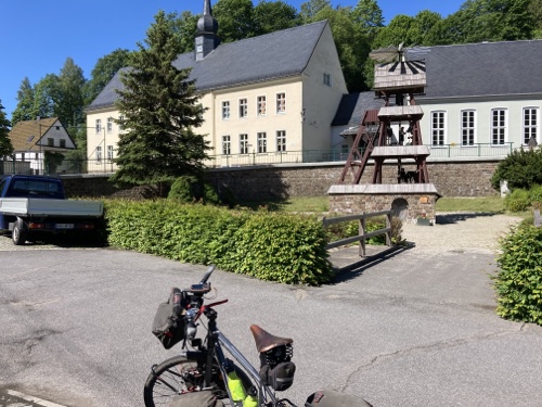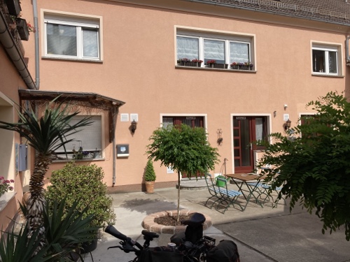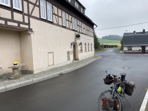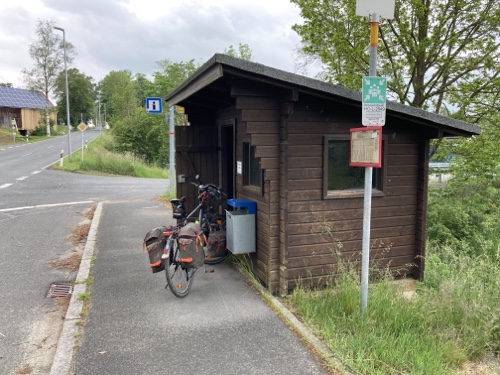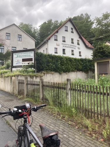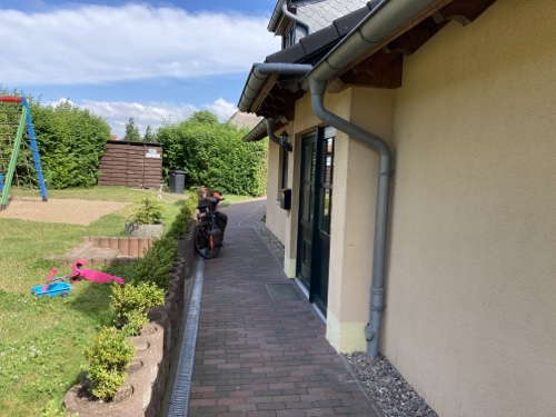 16.24 Uhr – An der Pension in der ich nun zwei Nächte bleiben werde. Eine Möglichkeit heute Abend etwas hier im Ort zu essen kannte die Frau am Telefon nicht. Sie hat mir nur den Code für den Schlüsselsafe gegeben. Für das Frühstück musste ich eine Liste ausfüllen. Einen Radschuppen kannte sie auch nicht, aber hinter dem Haus habe ich einen Fahrradständer gefunden, und es wird ja trocken bleiben.