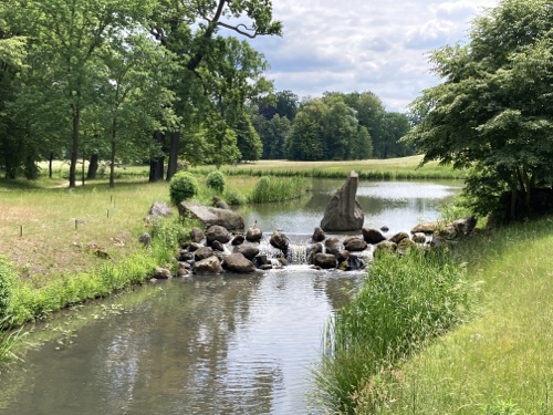 10.10 Uhr – Ich durchfahre den sehr schönen und großzügigen Park am Fischerdorf. Ein Graureiher steht auf einem der Steine im Wasser.