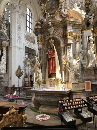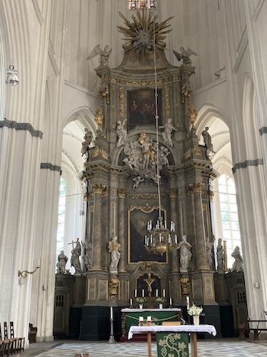 Der barocke Hauptaltar. Für eine gotische Kirche ist der Chorraum relativ dunkel. Die Obergaden sind klein, das die Seitenschiffdächer sehr steil sind.