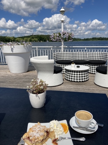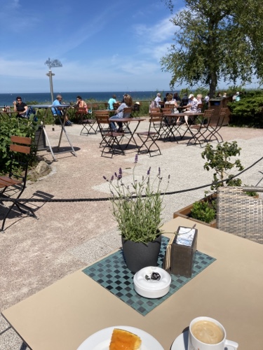 15.04 Uhr – Jetzt sitze ich auf der Terrasse des Hotels Wilhelmshöhe, mit weitem Blick über das Meer.