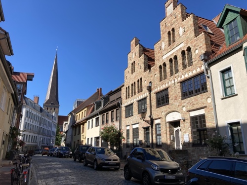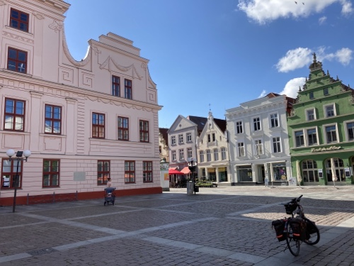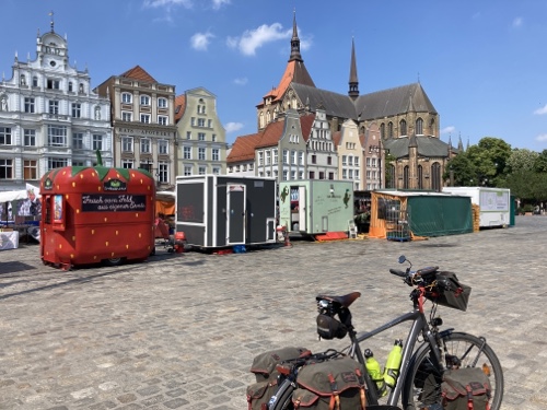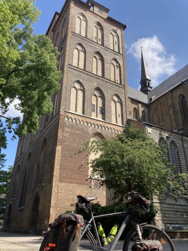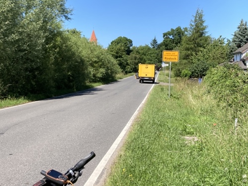 9.37 Uhr – Ich stehe mit dem gepackten Rad vor der Pension. Für die fünfzehn Kilometer bis Rostock kann ich mir Zeit lassen. St. Marien macht um elf auf. Der Zug steht ab 12.19 Uhr im Bahnhof und fährt erst um 12.44 Uhr los. Auch das ist sehr entspannt. Also los.