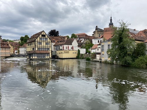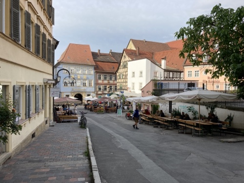 16:10 Uhr – Nach einem wuseligen Stück auf der Kanalpromenade bin ich mitten in der Inselstadt zwischen den beiden Regnitzarmen am Hotel Alt Bamberg. Der Schlüssel fiel nach Code-Eingabe aus dem Briefkasten. Dafür musste ich den Hotelier anrufen, der morgen zum Frühstück kommt.