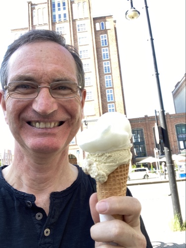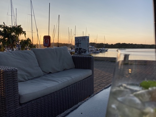 20.21 Uhr – Es ist doch ein gutes Stück bis hierher, nicht weit, aber es zieht sich. Daher habe ich doch das Fahrrad genommen. Das Essen, vor allem die Fritten, waren sehr lecker. Am letzten Abend der Reise gibt es nun noch einen Erdbeerbecher.