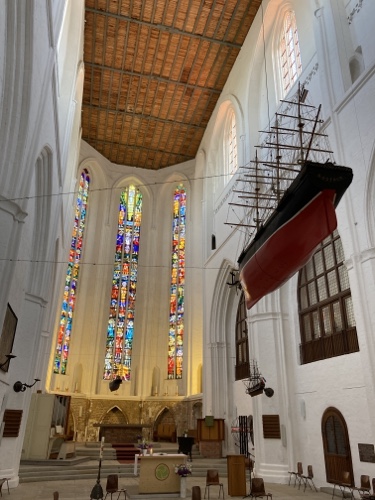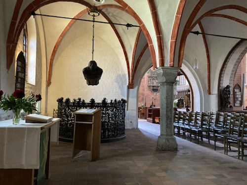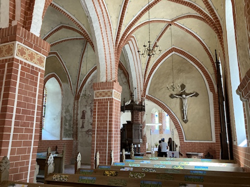 Am Gewölbeansatz erkennt man die hölzernen Zuganker mit denen das Auseinanderdriften der Wände verhindert wird.