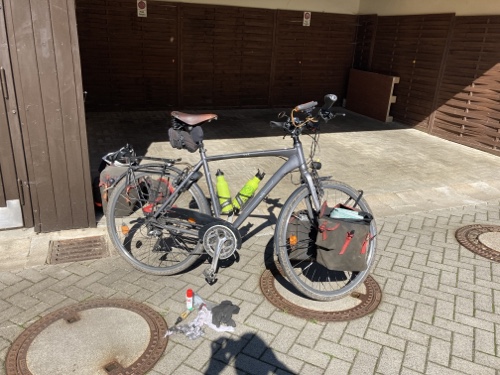 Am Fahrrad haben Regen und Matsch immer wieder Spuren an Kette und Ritzeln hinterlassen, die ich aber mit Lappen, Kettenöl und Ölspray beseitigen konnte. Ein größerer Lappen wäre bei dem vielen Dreck besser gewesen. Es war gut, neue Bremsbeläge dabei zu haben. Für die Tandemtour muss ich mir wieder Ersatz besorgen. Das merkwürdige Geräusch vom Hinterrad konnte ich mit dem Spannen einzelner Speichen anscheinend beseitigen. Ich hatte soweit also die richtigen Ersatzteile und Werkzeuge dabei.
