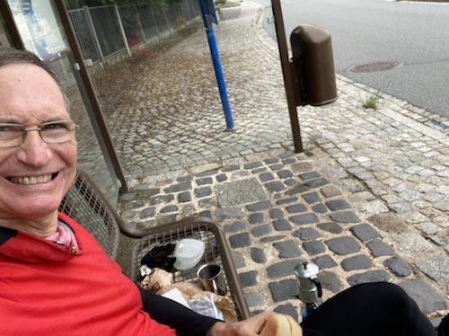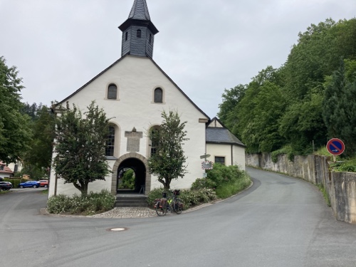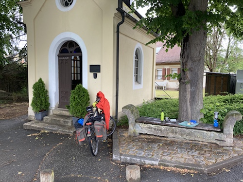 12.45 Uhr – Der Kaffee ist aufgesetzt an der Siechhauskapelle bei der Regnitzbrücke in Forchheim. Die Hotelbrote sind sehr lecker und dringend nötig.