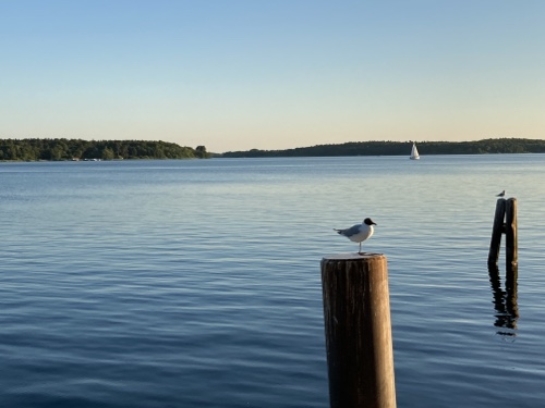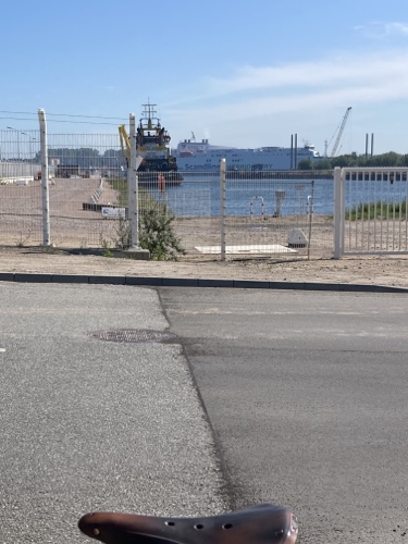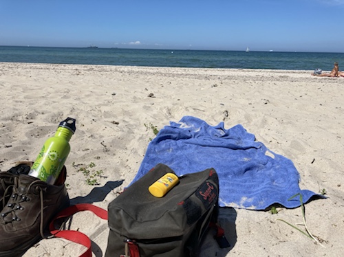Als ich kam, war es noch leer, jetzt wird es langsam voller. Die Luft ist sehr klar und man sieht die Fracht- und Fährschiffe vorbeiziehen. Heute wirft der Wind ein paar mehr Wellen auf als gestern. In der heißen Sonne ist es aber angenehm.