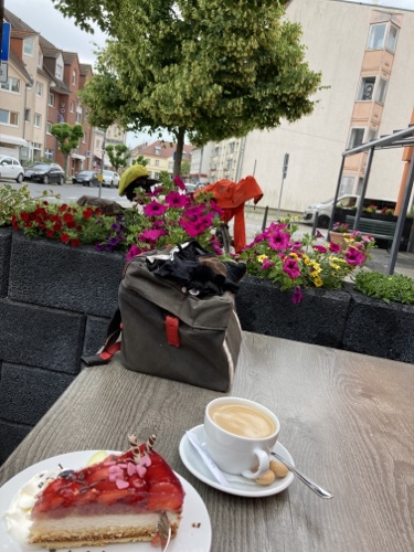 Die Verpflegung hat bis auf zwei Tage im Erzgebirge sehr gut geklappt. Morgens ein belegtes Brötchen und einen Apfel aus dem Hotel mitzunehmen sichert zusammen mit der Cafeteria die Grundversorgung. Die Kuchenstopps waren immer ein Genuss. Die Müsliriegel halfen an langen Tagen über Leistungseinbrüche hinweg.
