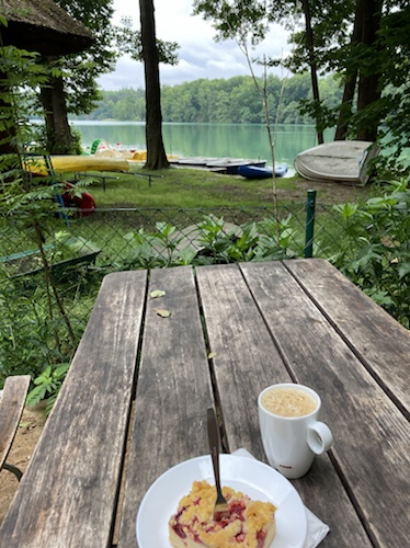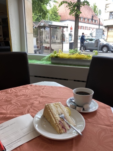 Die Kirschschnitte ist gut, der Kaffee schön heiß. Ich war bis gerade eben der einzige Gast.