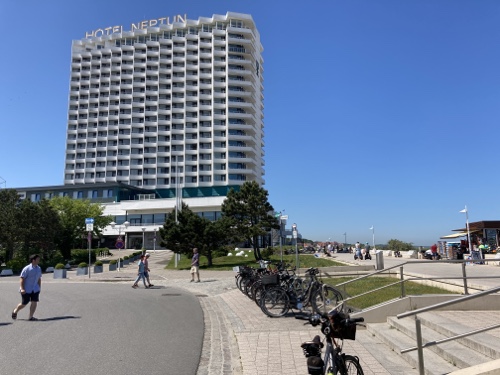 Das Hotel Neptun dominiert die Promenade. Es ist richtig voll hier. Ich radle noch ein Stück weiter nach Westen.