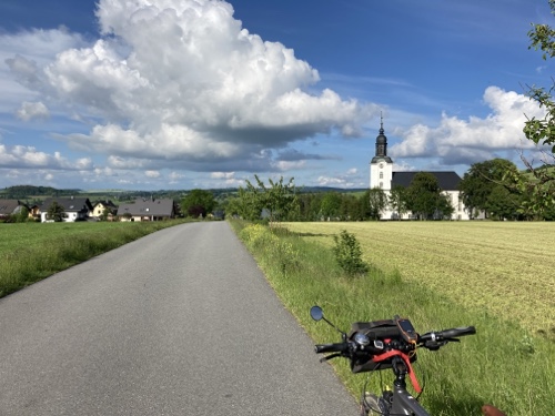15.32 Uhr – Schloss Strößendorf. Hier geht es schon etwas auf und ab. Das kleine Ritzel wird endlich mal wieder gebraucht. Aber ich bin noch nicht in Form, ist ja auch eine Trainingstour.