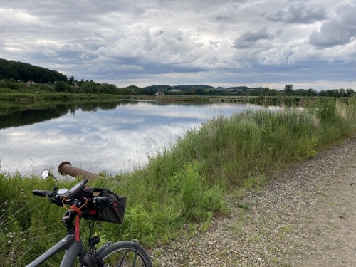 11.07 Uhr – Das Maintal ist hier sehr breit und flach mit vielen großen Kiesgruben-Seen. Der neue Teer des Radwegs lässt sich super fahren.