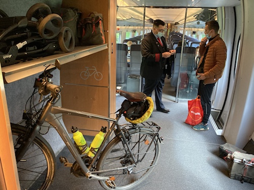 10:28 Uhr – Sitze im Großraumwagen, das Rad steht auf einem der drei Fahrradplätze. Der Schaffner war sehr nett. Er hat mir Hilfe mit dem Rad angeboten und gesagt, «Wir wollen ja, dass Sie sich hier wohlfühlen!» Wow!!