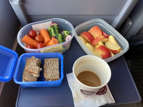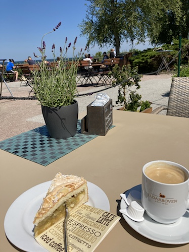 10:35 Uhr – Maskenpflicht. Aber zum Essen darf ich sie abnehmen! Habe mir einen Café Crême geholt, gleich nebenan im Speisewagen. So, jetzt entspannen!