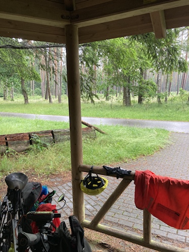 11.12 Uhr – Stehe unter einer Autobahnbrücke zwischen Eltersdorf und Bruck. Das Wasser bildet Pfützen auf den Taschen. Die Finger sind zu nass, um das Telefon zu entsperren. Ich komme aber gut voran, habe schon 18 Kilometer. Ich hoffe auf eine trockene Mittagspause.