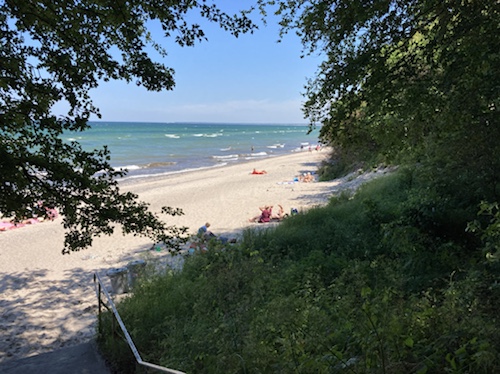 Ich radle durch den Waldstreifen oberhalb des Strands, den man über Treppen erreicht.