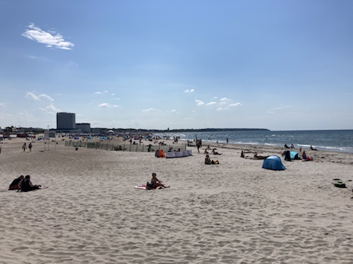 Von hier erst sieht man die Ausdehnung des tollen Sandstrands der Stadt. Im Hintergrund das Hotel Neptun.