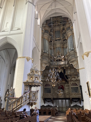 Die mächtige Orgel mit Fürstenloge und links davor die Renaissance-Predigtkanzel von 1574.