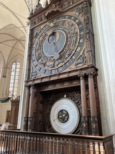 Hinter dem Hauptaltar befindet sich die große astronomische Uhr, die täglich aufgezogen werden muss. Sie zeigt oben Uhrzeit, Sonne und Mondphase sowie das Tierkreiszeichen.