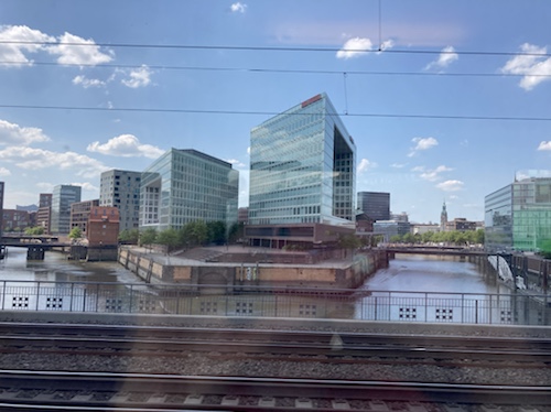 14.25 Uhr – in zehn Minuten sind wir in Hamburg. Die letzte halbe Stunde war die Landschaft vollkommen flach. Ich habe mir gleich hinter Rostock einen Kaffee im acht Wagen entfernten Speisewagen geholt. Dazu gab es das Brötchen aus der Pension und ein am Bahnhof gekauftes.