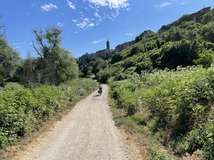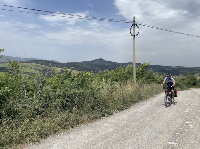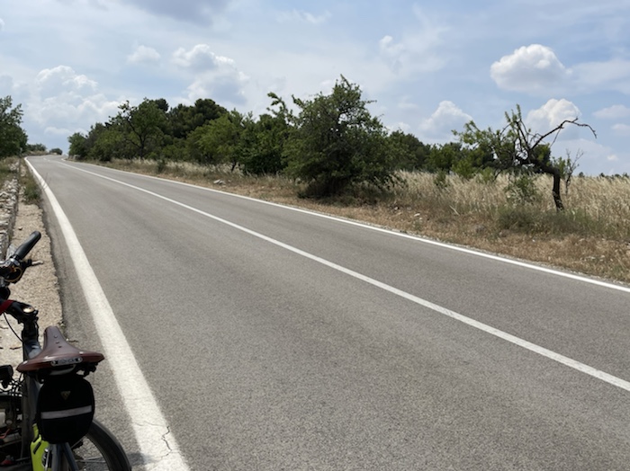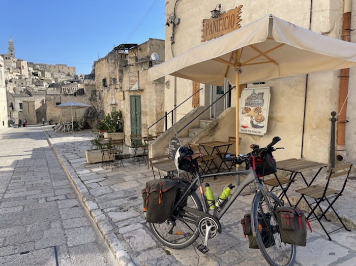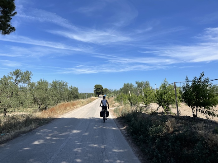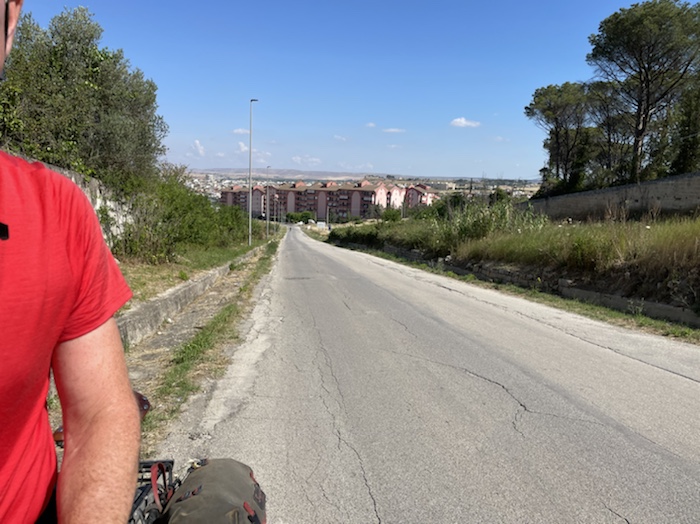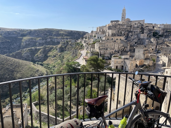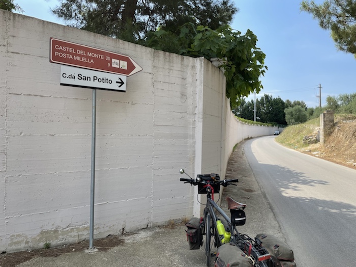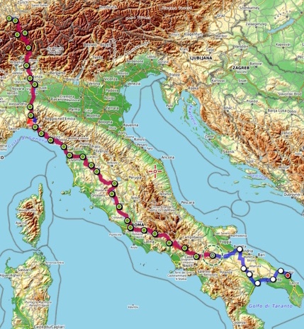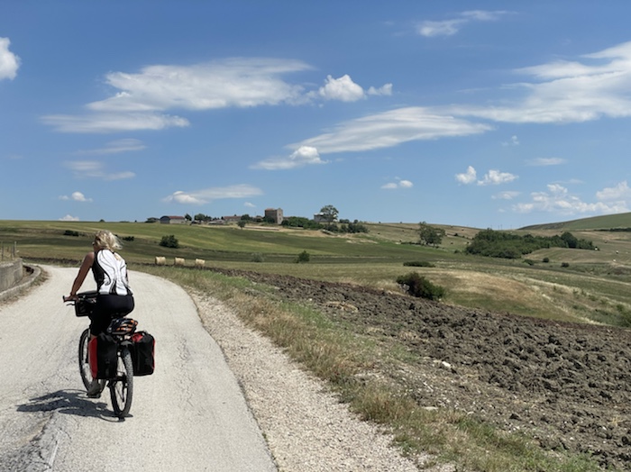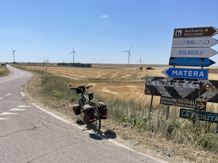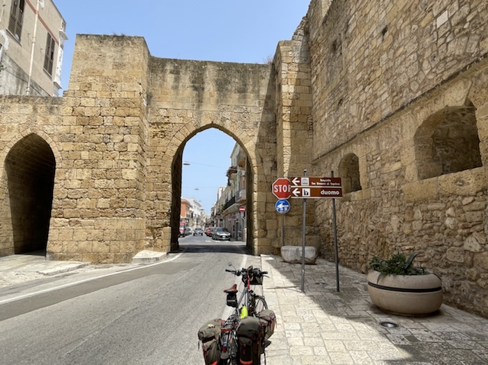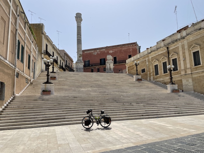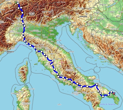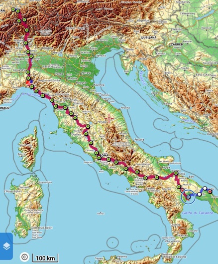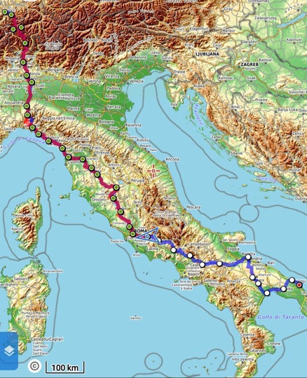 Ab Pisa folge ich bis Brindisi fast exakt der Via Francigena bzw. dem EuroVelo 5. Kurz vor dem Ende der Tour mache ich einen Abstecher zum Castel Monte, das ich gerne einmal sehen möchte. Danach, in der Basilikata, besuche ich Matera, die Weltkulturhauptstadt 2019, in der auch der aktuelle James Bond gedreht wurde. In Metaponto, einer von den Griechen gegründete Stadt mit vielen schönen Ruinen, erreiche ich das Ionische Meer. Über die Hafen- und Industriestadt Tarent komme ich schließlich nach Brindisi.