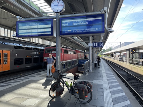 9.00 Uhr – Am Hauptbahnhof Bonn. Da die Aufzüge zu eng sind, habe ich die Rolltreppe abwärts genommen und das Rad (40 kg) danach die Treppe hinauf getragen. Aktuell hat der Zug zehn Minuten Verspätung, aber das wird sicher noch mehr.