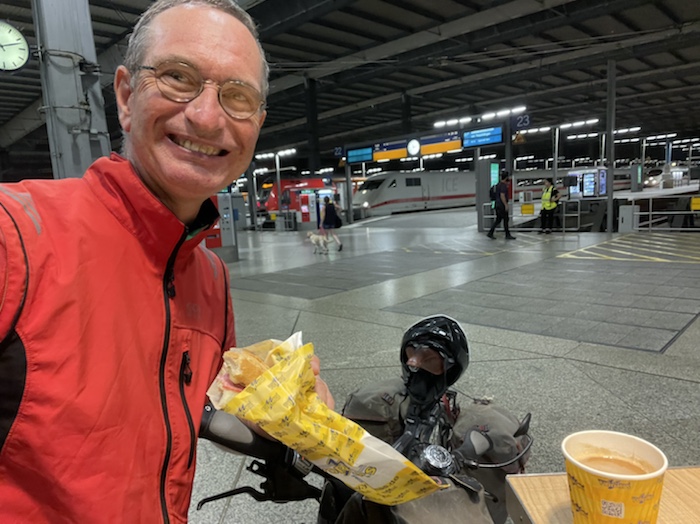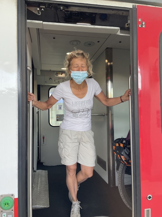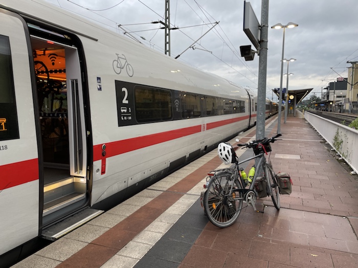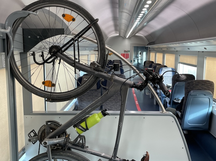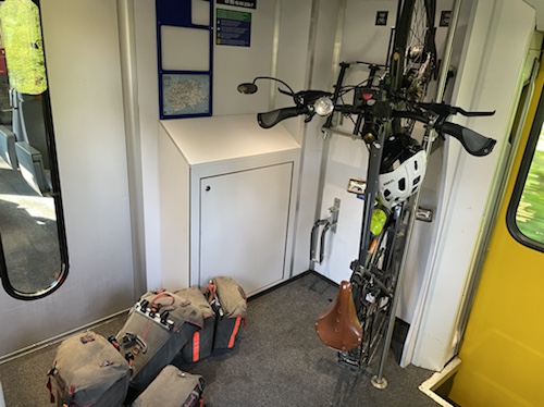 7.42 Uhr – Jetzt habe ich ihnen eine halbe Stunde das Gespräch gehalten. Sehr schöne Fahrradgeschichten, die die beiden erzählt haben. Der sehr nette Schaffner hat uns feste Plätze hier im Fahrrad-Wagon 3 zugewiesen, die nicht reserviert sind. So brauche ich nicht zum Wagen 6, wo mein reservierter Platz wäre, und habe das Rad direkt vor mir.