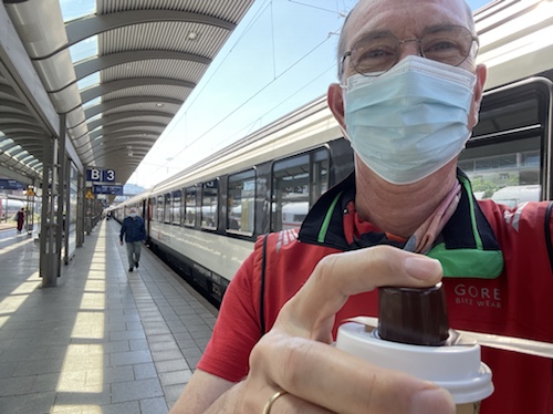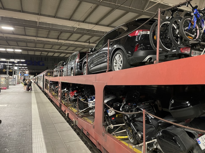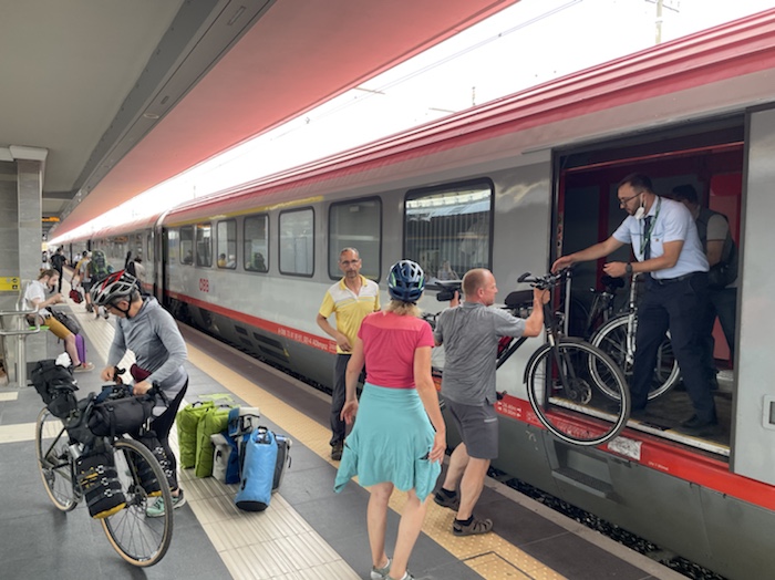 16.44 Uhr – Das Verladen der Räder hat Dank des Lademeisters der ÖBB super geklappt. Ohne Fahrrad-Platzreservierung ging aber nichts. Der Albanien-Radler, dem man nur eine Fahrkarte ohne Fahrrad verkauft hatte, musste draußen bleiben. Die beiden Berliner können auch nur bis Verona mitfahren, da sie keine Reservierung mehr machen konnten. Den Tipp, das Fahrrad über die ÖBB zu buchen, habe ich jetzt schon an viele weitergegeben.