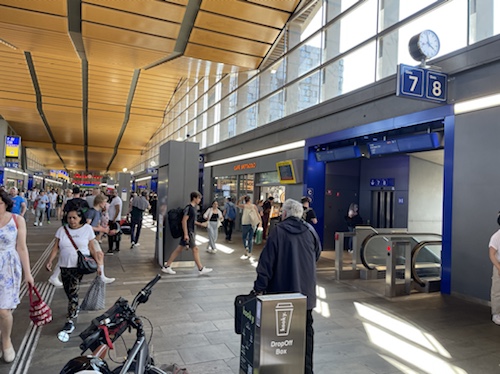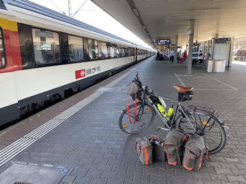 15.25 Uhr – Am Bahnhof: Ich muss auf Gleis 3, aber ohne Aufzug. Also wieder das Rad treppab und treppauf schleppen. Mehr muss ich für morgen jetzt nicht wissen. Also zum Hotel.