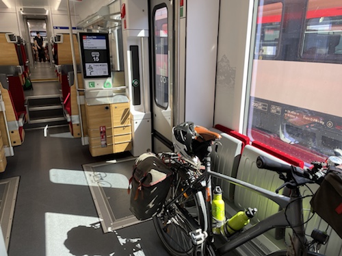 14,06 Uhr – In Rimini ist kein Radfahrer dazugekommen, also alles entspannt im Fahrradabteil. Nur noch eine Minute Verspätung. Wow!