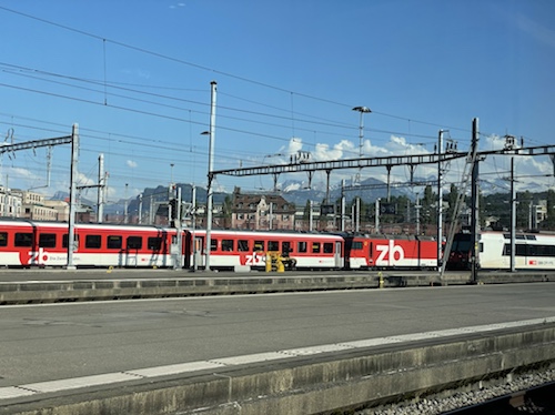 13.33 Uhr – Mit dreißig Minuten Verspätung in Freiburg. Jetzt gibt es aber auf dem letzten Stück einen Oberleitungsschaden mit Streckensperrung. Wir bleiben vorerst auf Gleis 3 stehen. Die App zeigt eine Weiterfahrt um 14 Uhr an. Mal sehen. Ich genieße derweil Brote und Rohkost von zu Hause und bin froh, dass ich noch einige spätere Züge von Basel nach Luzern nehmen kann.