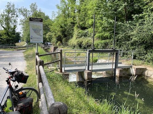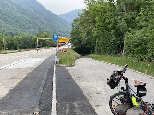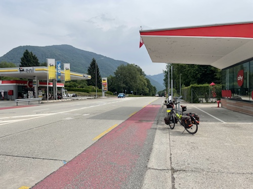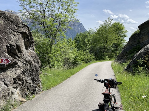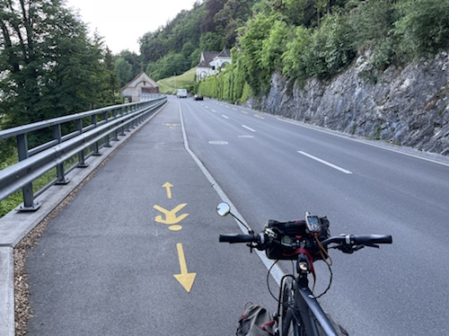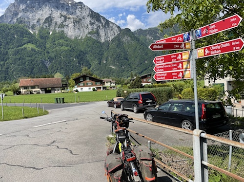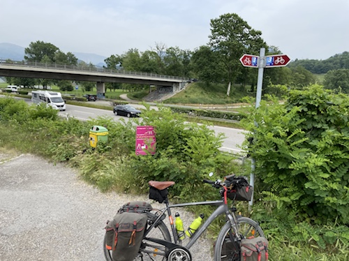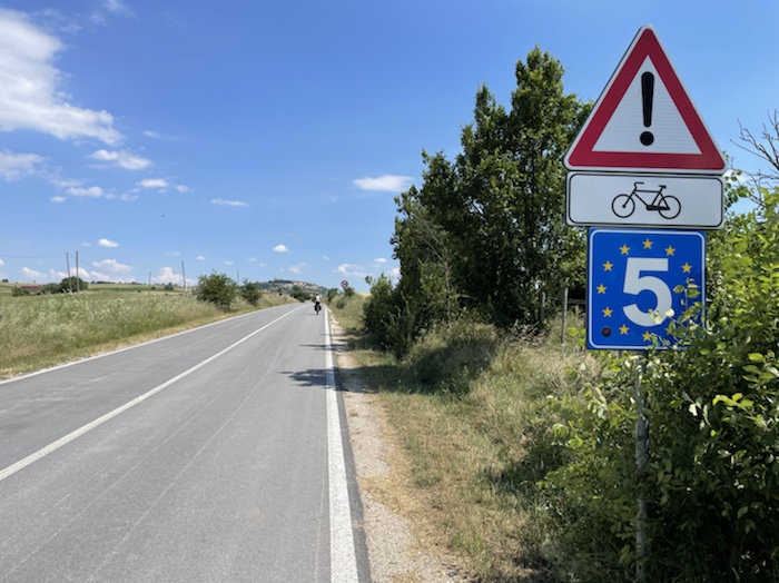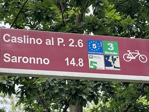 Hier ist oben die Schweizer Veloroute 3 mit der EuroVelo 5 Via Romea Francigena ausgeschildert, der ich, im wesentlichen, bis Brindisi folge.
